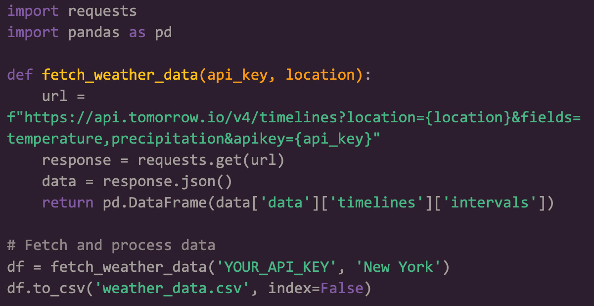 To construct a robust weather data pipeline, developers need to focus on three key aspects: defining how the data will be collected and placed in the database, creating scripts for pulling data and for updating data on a frequent basis. Thus, historical data of the weather as well as the weather forecast is always available for analysis to make sure that consistency is obtained.